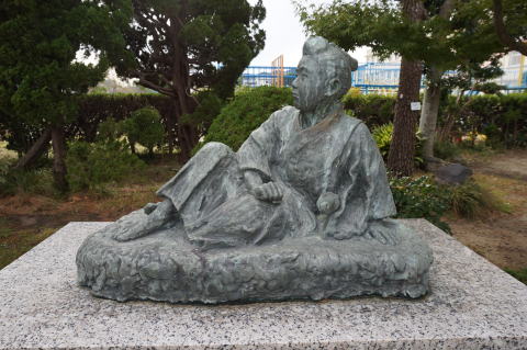 渡辺崋山が12歳の時、江戸日本橋付近で岡山藩の大名行列を横切ってしまい、大勢の前で叩かれたり罵られた姿の像で、